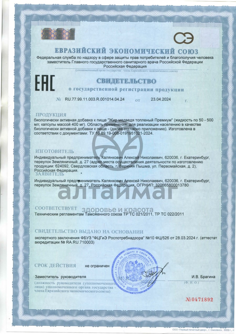 Жир медведя топленый в капсулах. Природный комплекс белков, нуклеиновых кислот, витаминов, минеральных веществ, оказывает общеукрепляющее, бактерицидное действие, обладает иммунокорегирующим свойством - укрепляет иммунитет, повышает сопротивляемость болезням, профилактика простудных заболеваний, заболеваний дыхательных путей, бронхита, пневмонии, защищает печень от химического воздействия лекарств, повышает физическую активность.