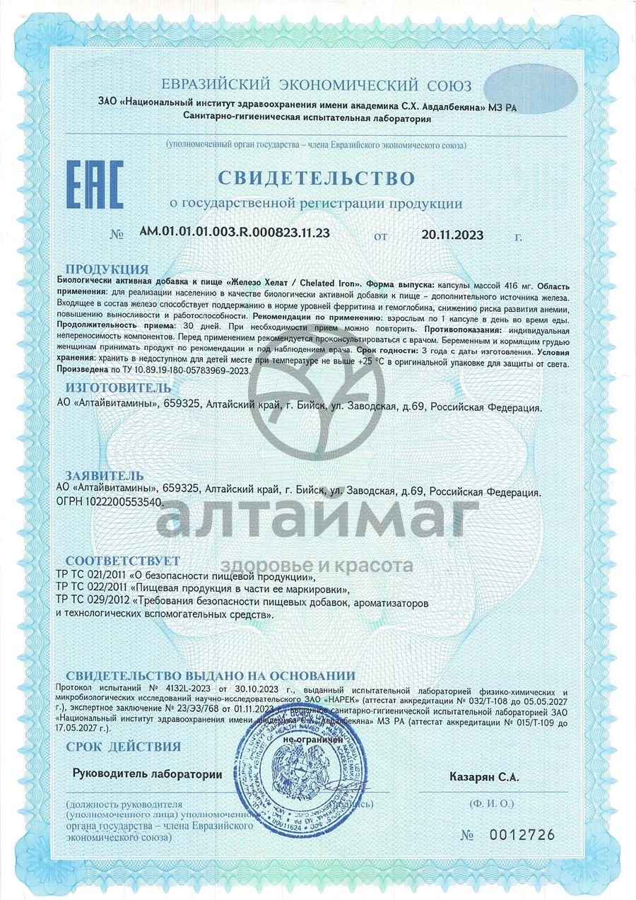 В препарате от фармацевтической компании АЛТАЙВИТАМИНЫ используется бисглицинат железа – хелатная форма этого микроэлемента, в которой он связан с глицином. Взаимодействие именно с этой аминокислотой обеспечивает стабильную молекулу, устойчивую к агрессивной желудочной среде, а низкая молекулярная масса способствует легкому абсорбированию железа кишечником.